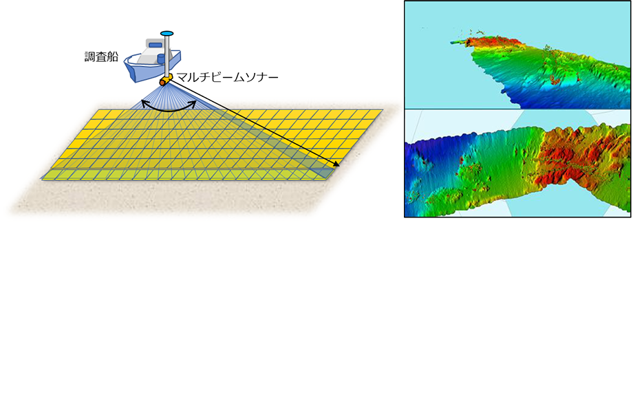 マルチビーム測深では、扇状に音波を発振することで面的な測深が可能となります(左図)。これにより詳細な地形データを取得することができます。